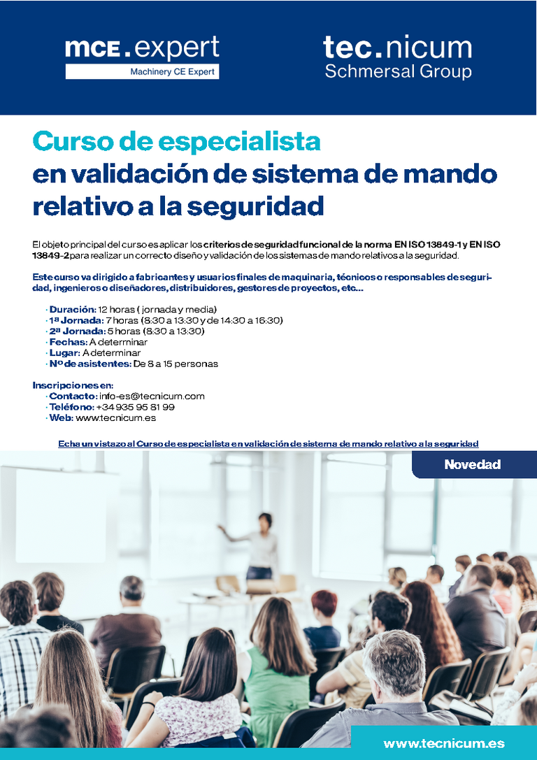 El objeto principal del curso es aplicar los criterios de seguridad funcional de la norma EN ISO 13849-1 y EN ISO 13849-2 para realizar un correcto diseño y validación de los sistemas de mando relativos a la seguridad.